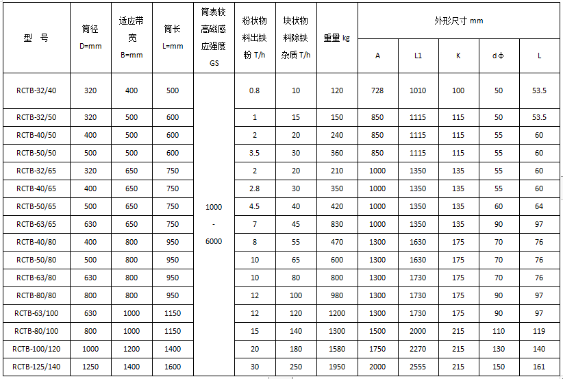 注:筒表較高磁場強度值是根據(jù)不同礦物含鐵情況和不同的選別要求確定的。磁場強度范圍從1000GS至6000GS均可制作。