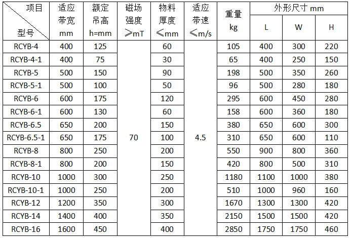 注:本系列各型號均有高于國標(biāo)的加強型T1、T2、T3產(chǎn)品設(shè)計,額定吊高處磁場強度分別為90mT、120mT、150mT。